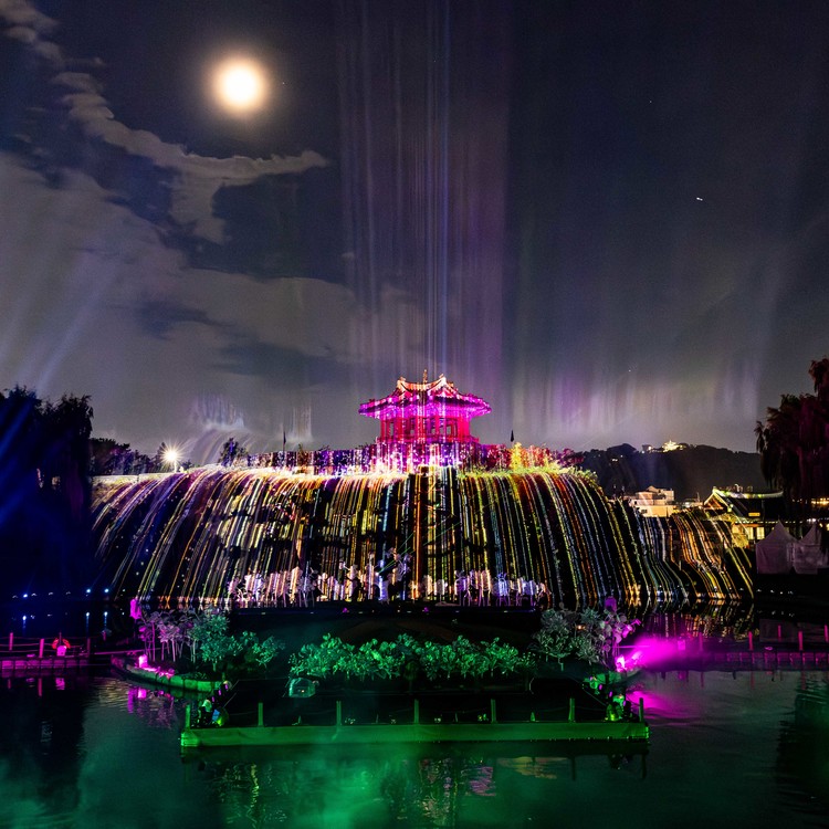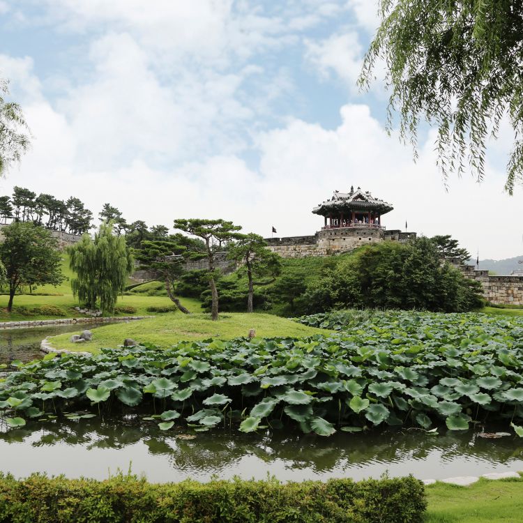 Set against Yongyeon Pond beneath Banghwasuryujeong in the northeast of Hwaseong Fortress, where King Jeongjo once enjoyed poetry and music with his mother, Lady Hyegyeong-gung Hong, a grand water performance unfolds. It takes the Joseon-era boat excursion Seonyu-nori as its motif, blending light, water, and sound into the show.